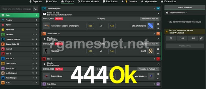 O 444Ok oferece uma grande seleção de opções de apostas em e-sports com probabilidades competitivas